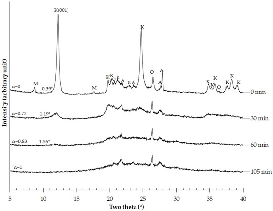 Initially, XRD was used to examine the effect of TR addition on the mechanochemical amorphization of kaolinite. At different grinding times, XRD patterns of samples with varying amounts of TR (ZK, 75ZK, 50ZK, and 25ZK) were measured. As an example, Figure 1 illustrates the XRD patterns of the 75ZK sample ground for 0, 30, 60, and 105 min. The XRD pattern of the raw sample (0 min) indicates that kaolinite (K) is the major phase, while muscovite (M), albite (A), and quartz (Q) are the minor phases. The XRD patterns of ground samples show that the increase in grinding time caused the broadening of the kaolinite reflections (K) and a decrease in their intensity (area) due to the deformation and amorphization of the crystal structure [22,50,51,52,53]. In addition to the reflections of kaolinite (K), the reflections of muscovite (M) and albite (A) declined and broadened because of MCA, while the reflections of quartz (Q) did not show remarkable changes. These results are in accordance with previous research [24,28,31,47,48]. After 105 min of grinding, all kaolinite reflections disappeared and only an amorphous hump remained at around 22° 2θ, which can be attributed to the amorphized kaolinite, muscovite, and albite phases. During the MCA, similar changes were observed in the XRD patterns of ZK, 50ZK, and 25ZK samples (not presented). To compare the amorphization process of kaolinite in samples with different TR contents, the degree of amorphization (α) was determined using the K(001) reflections of the XRD patterns (e.g., Figure 1) [33,49].