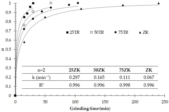 In Figure 2, the increase in TR content caused an increase in the slopes of the kinetic curves and, thus, the acceleration of the amorphization. The acceleration of amorphization is characterized by the fact that the rate constant (k) increased by nearly 2, 3, and 5 times with the addition of 25, 50, and 75 m% of TR, respectively. This means that the abrasive TR grains, similarly to previous results with quartz, silica fume (SF), or diatomaceous earth (DE) grains [24,33], act as extra grinding bodies, increasing the introduced grinding energy [19,33]. The effect of the TR contents of the samples is a little weaker than the effect of the SF or DE contents. The average degree of the amorphization of samples containing TR was about 0.07 lower for the identical grinding parameters. As the addition of 25m% TR effectively doubled the amorphization rate of kaolinite, the 75ZK sample was chosen to determine the effect of various grinding parameters.