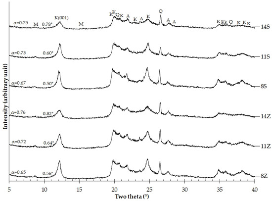 X-ray diffraction (XRD) is one of the most important methods to characterize the amorphization of kaolinite during mechanochemical activation [44,45,46,47,48]. XRD patterns were measured with CuKα radiation (λ = 0.1541 nm), at 50 kV and 40 mA using a Philips PW 3710 diffractometer (Philips Analytical B.V., Almelo, The Netherlands) with a graphite diffracted-beam monochromator. Data collections and evaluations were performed with X’Pert Data Collector (2.0e, PANalytical B.V., Almelo, the Netherlands, 2010) and HighScore Plus (5.0, Malvern Panalytical B.V., Almelo, the Netherlands, 2021) software. The profile fitting option of HighScore Plus software was used to determine the full width at half-maximum (FWHM) value and the integral intensity of the 001 kaolinite reflection. To quantitatively characterize the MCA of kaolinite, the degree of amorphization (α) was used. It was calculated as the reduction ratio of the area of the 001 kaolinite reflection of the activated and non-activated samples with the same composition (the standard error of the degree of amorphization was 0.02) [33,49]. The 00-014-0164, 00-033-1161, 00-007-0025, and 00-041-1480 Powder Diffraction File (PDF) of International Centre for Diffraction Data (ICDD) of kaolinite, quartz, muscovite, and albite, respectively, were used to identify crystalline phases.