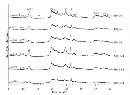 XRD patterns of the 75ZK samples ground for 15 min with different rotational speeds using the P6 and P5/4 planetary mills. (The degree of amorphization (α), the FWHM value of the K(001) reflection are indicated. M: muscovite; K: kaolinite; Q: quartz, A: albite).