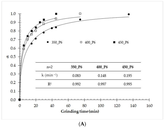 Changes in the degree of amorphization of kaolinite as a function of grinding time for the 75ZK samples ground with different rotational speeds using the P6 (A) and P5/4 (B) planetary mill. Tables show the fitted parameters (k and R2) for the P6 and P5/4 planetary mills.