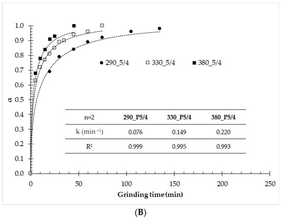 In Figure 6, the kinetics of the mechanochemical amorphization are shown at 290, 330, and 380 rpm for the P6 and P5/4 planetary mills. The increase in rotational speed resulted in an increase in the slopes of the curves, which indicates the speed-up of the amorphization. Increasing the rotational speed from 290 to 380 rpm increases the rate constant (k) from 0.076 min−1 to 0.220 min−1, which represents the acceleration of the amorphization process. In the case of P6 planetary mill, a similar increasing tendency of k value (from 0.083 min−1 to 0.194 min−1) with the rotational speed was obtained. The replacement of the P6 planetary mill with the P5/4 one increased the i value from 1.82 to 2.19, which raised the collision energy of the grinding bodies 48% (Equations (1)–(3)). This allowed for the reduction in rotational speeds from 350, 400, and 450 rpm to 290, 330, and 380 rpm at the same degree of mechanochemical amorphization, respectively. This might be beneficial to the decrease in aggregation and agglomeration. The highest amorphization rate of kaolinite was obtained at 380 rpm with the P5/4 planetary mill. It should be mentioned that the increase in the rotational speed from 290 to 330 rpm doubled the rate of amorphization (k), but the increase in the rotational speed from 290 to 380 rpm only raised it by 2.9 times.