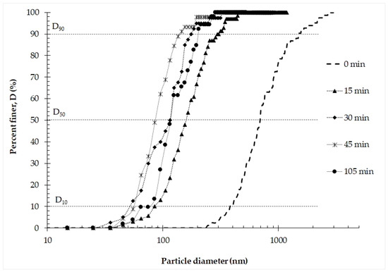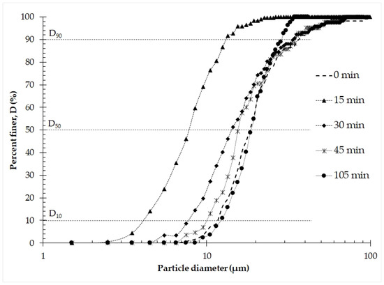 Following that, SEM images were analyzed in order to determine the SPS and PPS distributions of 75ZK samples ground for various times, which are presented in Figure 8 and Figure 9 as cumulative distribution (D) curves. After 15 min of grinding, the SPS distribution curve is shifted towards smaller particle sizes, indicating the formation of finer aggregates. For the samples ground for longer times (30, 45, and 105 min) (compared to the sample ground for 15 min), the SPS distribution curve is shifted to larger particle sizes, which is connected to the increased aggregation and agglomeration during MCA [19,33]. For up to 45 min of grinding, the PPS distribution curves are moved toward smaller particle sizes; then, the PPS curve is returned to greater particle sizes at 105 min of grinding. The PPS values are decreased significantly at 15 min of grinding and then they are slightly reduced for up to 45 min. The SPS and PPS distribution curves of the samples activated with different grinding parameters (not presented) show similar patterns. For comparison, the diameters of the D curves corresponding to 10% (D10, effective size), 50% (D50, median size), and 90% (D90) were determined as characteristic particle sizes (Figure 8, Table 3).