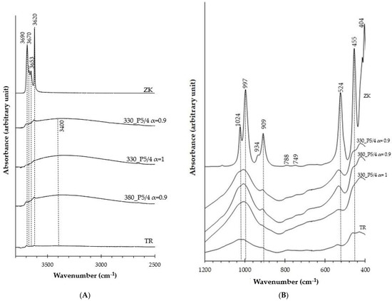 FTIR spectra of the ZK, the 330_P5/4 α = 0.9 and α = 1, the 380_P5/4 α = 0.9, the TR samples: (A) in the 2500–3800 cm−1 region, (B) in the 400–1200 cm−1 region.
