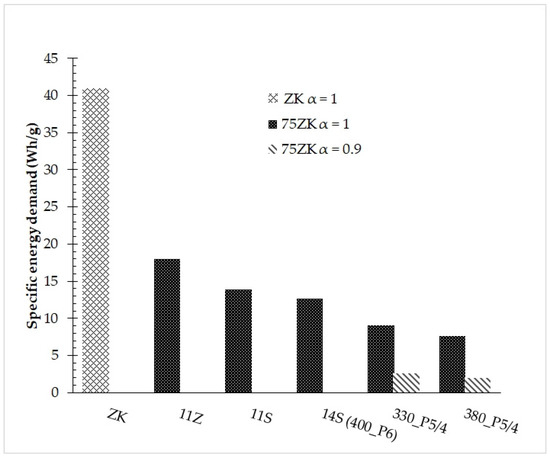A correct assessment of the effect of the grinding parameters on the efficiency of MCA requires an examination of the specific energy demand (per unit mass). In Figure 12, the specific energy demand of MCA with various grinding parameters is shown. According to Figure 12, the addition of 25 m% TR (11Z) can reduce the specific energy demand of the MCA of raw kaolin (41 Wh/g) by almost 50%. Thus, this relatively small amount of TR, acting as a grinding body, can significantly increase the efficiency of MCA. The application of steel grinding material (11S) instead of ZrO2 (11Z) reduced the specific energy demand of MCA by a further 10%. This is due to the fact that the higher density steel allows for the MCA of a larger amount of samples at the same BPR. The increase in the BPR from 11:1 (11S) to 14:1 (14S) did not cause a noteworthy reduction (2%) in the specific energy demand of the MCA. However, compared to the MCA with the same sample amount (11Z), the steel grinding material (14S) reduced the specific energy demand by 12%. This result can be explained by Equations (3) and (4), which indicate that the increase in the density of the grinding bodies raises the cumulative energy [57]; thus, it can reduce the specific energy demand of kaolinite amorphization. Afterwards, the application of the P5/4 planetary mill instead of the P6 one, using the 14S and 330_P5/4 MCA with the same amorphization rate constant (k), can further reduce the specific energy demand by about 10% (4 Wh/g). As the energy uptake of the mill is primarily dependent on the rotational speed of the main disk [31], this reduction is due to the increase in the i value from 1.82 to 2.19 (Equations (1)–(4)). At the same time, the increase in the rotational speed from 330 rpm to 380 rpm caused only a 3% (1.4 Wh/g) reduction in the specific energy demand of the MCA. Since the agglomeration reduces the SSA value (and chemical reactivity) of the sample activated at 380 rpm compared to that of the sample activated at 330 rpm, the use of 380 rpm is not recommended for the MCA of kaolin. As in our previous study [28], a higher pozzolanic reactivity was obtained with the incompletely amorphized (α = 0.9) samples than the completely amorphized (α = 1) ones; the specific energy demand of these samples is also examined in Figure 12 (75ZK = 0.9). The specific energy demand at 0.9 degrees of amorphization is less than half that at 1.0 degrees of amorphization. Consequently, if the MCA of kaolin is performed with the addition of 25 m% of TR, steel grinding bodies and jar, 14:1 BPR, the P5/4 planetary mill, 330 rpm, as well as 0.9 degrees of amorphization, the specific energy demand can be decreased by 94% (from 41 Wh/g to 2.6 Wh/g).