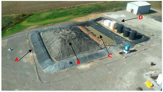 Aerial view of the baker seam coarse refuse heap (A) HDPE plastic liner, (B) Coarse refuse material, (C) Collection Pond, (D) Storage tanks.
