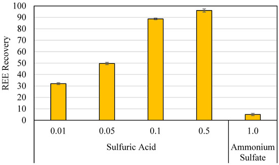To identify the leaching characteristics of the lignite waste material, a series of leaching experiments were performed over a range of sulfuric acid concentrations at 1% S/L (w/v), 75 °C for 2 h. All the leaching parameters were employed to provide a direct comparison between the extensive leaching studies reported previously from different coal sources [15,26,27]. It was determined that mild acid-leaching conditions could be used for REE extraction without any thermal treatment (Figure 3). Rare earth element recovery improved from 32% to 88% when sulfuric acid concentration increased from 0.01 mol/L to 0.1 mol/L. A further increase in sulfuric acid concentration to 0.5 mol/L increased the REE recovery to 96%. Additionally, a leaching experiment using 1.0 mol/L ammonium sulfate as the lixiviant recovered only 5% REEs, implying that most REEs arion-exchangeable exchangeable form [28]. The individual REE recoveries at various sulfuric acid concentrations are presented in Figure S1.