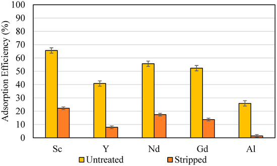 The initial test was performed by mixing the untreated material with the stock solution. It was found that the untreated solids had significantly high adsorption efficiency for all elements added to the model system (Figure 4). For instance, scandium removal from the solution was 65%, whereas Nd and Gd adsorption efficiency was 55% and 52%, respectively. These results confirmed the hypothesis that the REEs from the solution could be adsorbed on the lignite. Interestingly, the adsorption efficiency for aluminum was approximately 25.9%. Since the initial concentration of Al was 20× higher than the REEs, the absolute concentration adsorbed for Al would be much higher than the REEs. Therefore, it is likely the aluminum ions preferentially consumed the rare earth binding sites, which contributed to a lower adsorption efficiency for REEs [34,35]. A more detailed discussion on this subject is presented later in the paper. Interestingly, due to elevated calcium content in the solids, which increased the neutralization potential of the solids, the solution pH drifted from 2.0 to 3.9 within the first five minutes of the reaction. Since the aluminum precipitation from the PLS starts at 3.5 and accelerates exponentially to 4.5, a portion of the adsorption efficiency increase for aluminum may be contributed by its precipitation at the higher pH levels [36]. However, since REE precipitation is minimal at pH 4.0 in a sulfate system, the reported adsorption efficiency for REEs is not expected to be influenced by their precipitation.