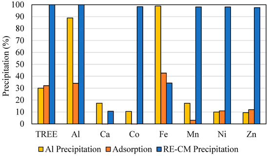 The adsorption efficiency for REEs, Mn, Ni, and Zn in the test was approximately 32%, 17%, 10%, and 9%, respectively (Figure 7). The contaminants ions, such as Al and Fe, showed relatively higher precipitation efficiencies compared to REEs. Since it is not possible to distinguish between elements adsorbed and precipitated at this stage, it is anticipated that at least some of the Al and Fe adsorption efficiency increase was caused by simple precipitation of these elements in this pH range. Interestingly, there was no adsorption of Ca and Co. In fact, both elements were leached from the solids with 43% and 2% recoveries, respectively. Removal of significant calcium concentration in this stage is anticipated to provide economic benefits with respect to chemical consumption when treating this feedstock for hydrometallurgical extraction. Finally, increasing the solution pH to 9.0 removed the remaining elements of interest from the solution. Since most of the calcium precipitates in the basic pH range above 9 (Figure 4), its precipitation efficiency was lower than other elements. However, it should be noted that considering the prior leaching of Ca in the adsorption stage, a small percentage of calcium in the cake will translate into significant content due to its elevated concentration in the feed solution.