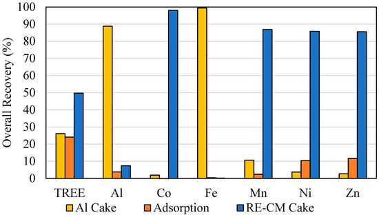 Considering distinct mass losses in the different precipitation stages along with the elemental assays of the cakes, unit recovery values do not provide complete information. Therefore, it is crucial to normalize the complete data set relative to the feed content i.e., mass distribution/overall recovery values. For instance, it is evident from the data shown in Figure 8 that almost all the Fe and most of the Al were precipitated in the aluminum precipitation stage. Similarly, rare earth elements removed from the PLS in the adsorption stage represented approximately 22% of the TREEs present in the system. Most of the REEs and other critical metals are reported to the RE-CM cake, which is a result of low removal efficiencies in the adsorption stage. It is likely that low REE removal during the adsorption stage was due to the significantly lower solid content relative to the volume of the PLS and/or, the limited residence time provided in the filter for adsorption. A more detailed discussion is provided later in this publication.