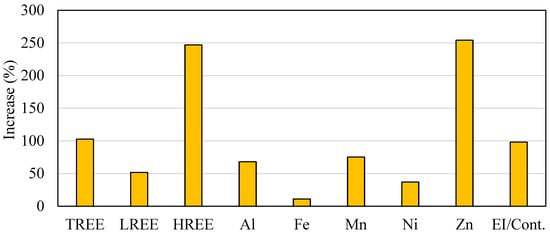 Increase in the light (LREE), middle (MREE), and heavy rare earth element (HREE) contents of the lignite waste material after the pilot plant adsorption test.