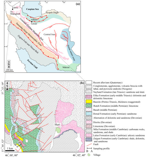 The Huri bauxite deposit is located 40 km northwest of Maragheh City, East Azerbaijan province, northwestern Iran (Figure 1a). According to the tectono-metamorphic zonation of Iran [25], the Huri bauxite deposit occurs within the Alborz–Azerbaijan zone. The oldest rock units in the study area are early Cambrian micaceous silty shales, dolomites, and sandstones of the Zaigun Formation. These rock units are overlain by early Cambrian arkosic sandstones of the Lalun Formation and middle Cambrian carbonate, sandstone, and shale of the Mila Formation. The Devonian limestone, diorite, and alternating dolomite and sandstone are overlain by early Permian sandstones of the Dorud Formation, middle Permian basalts, and limestones of the Ruteh Formation. The Triassic stratigraphic units consist of a thick sequence of sedimentary rocks. They include early–middle Triassic dolomite and dolomitic limestone of the Elika Formation and late Triassic sandstone and shale of the Nayband Formation. The youngest rock units are Neogene conglomerate, agglomerate, and breccia with a lesser amount of lahar and pyroxene andesite and Quaternary alluvial sediments (Figure 1b).