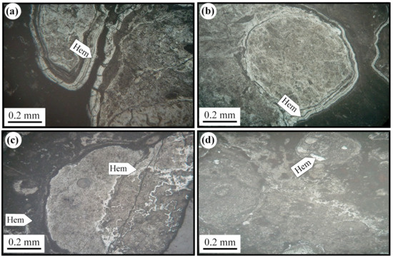 Photomicrographs showing petrological aspects in the Huri bauxite deposit. (a–d) The occurrence of hematite in the form of layering, secondary coatings around spheroidal components, and the core of ooids and pisoids. All images were taken under reflected light. Abbreviations: Hem = hematite [30].