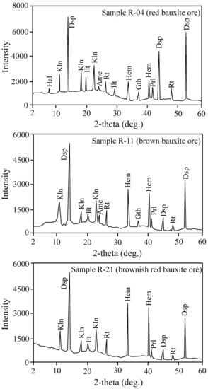 Powder-XRD patterns of representative bauxite samples from the Huri deposit. Ame = amesite, Dsp = diaspore, Gth = goethite, Hal = halloysite, Hem = hematite, Ilt = illite, Kln = kaolinite, Prl = pyrophyllite, Rt = rutile; mineral abbreviations from [30].