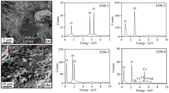 SEM–EDS results of the Huri bauxite deposit, East Azerbaijan province, northwestern Iran. (a) Zircon and kaolinite in sample R-02 from the RBO subset. (b) Monazite and diaspore in sample R-09 from the BBO subset. Abbreviations: Dsp = diaspore, Kln = kaolinite, Zrn = zircon, Mnz = monazite [30].