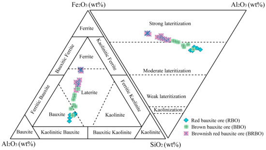 Al2O3–SiO2–Fe2O3 ternary plots [32,34] showing mineralogical classification and lateritization degree of the Huri bauxite samples.