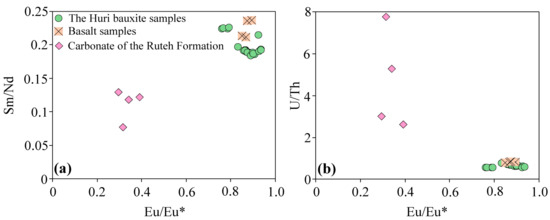 Bivariate plots of Eu/Eu* vs. Sm/Nd (a) and U/Th (b) representing affinity of the Huri bauxite samples with basalt rocks interbedded in limestone of the Ruteh Formation.