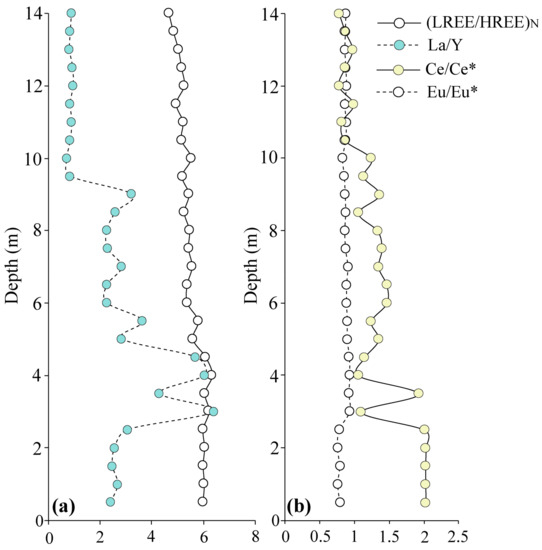 In addition to the nature of precursor rocks, physicochemical conditions of weathering environment, and complexation and adsorption mechanisms, the mobility and fractionation of REE during weathering processes can be associated with the preferential dissolution of certain REE minerals. Fractionation of LREE from HREE in bauxite samples can be explained by the formation of Fe (oxyhydr)oxides, clay minerals, and P-bearing minerals as scavengers of LREE. The presence of weathering-resistant REE-bearing minerals, such as monazite, leads to enrichment of LREE in the upper parts of the succession. Some geochemical investigations of bauxite deposits show that both LREE and HREE act as mobile elements during pedogenesis processes [41], while LREE in this study are more mobile than HREE during weathering, as stated by some researchers in the course of weathering [42]. This conclusion is manifested by a slightly increasing (LREE/HREE)N ratio from the top of the profile downward toward the BBO and BRBO subset ores (Figure 8a). In fact, the carbonate bedrock of the Ruteh Formation as a chemical barrier had a significant effect on increasing pH of acidic solutions percolating downward. Therefore, it suggests that pH was one of the key factors controlling the fractionation and mobility of REE in the weathered profile of the Huri bauxite deposit. As the pH of percolating acidic solutions increases downward the profile, the extent of REE-bearing minerals identified by SEM–EDS remarkably decreases. Mineral control (adsorption of LREE by hematite) may be an effective mechanism for the fractionation of LREE from HREE in the Huri bauxite samples, in which Fe content is much higher than Na, K, and P content. The La/Y ratio shows an uneven increase in the downward trend (Figure 8a). This ratio was used to determine the change in pH weathered environment during bauxitization. According to Crnički and Jurković [43], the La/Y ratio below and above 1 represents acidic and alkaline environments, respectively. The increasing downward La/Y ratio suggests alkaline conditions prevailing at the base of the Huri weathered profile. Erratic trends in (LREE/HREE)N and La/Y ratios in the Huri bauxite samples that represent leaching and concentration of REE along the studied profile are generally ascribed to fluctuations in the groundwater table level during the development and formation of the bauxite body. Groundwater fluctuations are generally controlled by seasonal successive changes in precipitation during rainy and dry seasons [33].