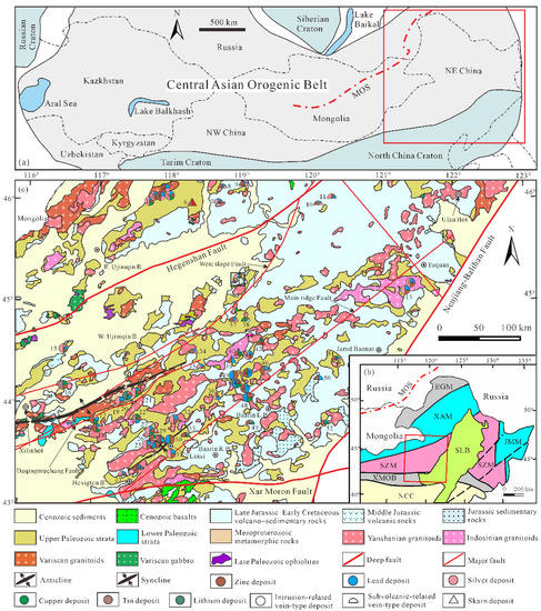 (a) Sketch geological map of the Central Asian Orogenic Belt (modified after [24]), showing the location of NE China; (b) simplified geotectonic division of NE China (after [25]); (c) geological map of the southern Great Xing’an Range and its neighboring areas, showing locations of major Pb–Zn–Ag–polymetallic deposits (geological base map modified after [9]; ore deposits modified after [13]). Notes: EGM = Ergun massif; JMM = Jiamusi massif; MOS = Mongol–Okhotsk suture zone; NCC = North China craton; SLB = Songliao basin; SZM = Songnen–Zhangguangcai Range massif; XAM = Xing’an massif; XMOB = Xar Moron orogenic belt. Names of numbered Pb–Zn–Ag–polymetallic deposits: 1 = Hua’naote Ag–Pb–Zn–Cu deposit; 2 = Highland 1017 Ag–Pb–Zn deposit; 3 = Buyan’alin Pb–Zn–Ag deposit; 4 = Dugerlin Pb–Zn–Ag deposit; 5 = Jilinbaolige Ag–Pb–Zn–Cu deposit; 6 = Chagan’aobao Zn–Fe deposit; 7 = Wulantaolegaidong Ag–Pb–Zn deposit; 8 = Gunhudugengou Pb–Zn–Ag deposit; 9 = Lemageshan Pb–Zn–Ag deposit; 10 = Zhamuqin Pb–Zn–Ag deposit; 11 = Fuxingtun Ag–Pb–Zn deposit; 12 = Huaaobaote Ag–Pb–Zn–Cu–Sn deposit; 13 = Maohuduger Ag–Pb–Zn deposit; 14 = Meng’entaolegai Ag–Pb–Zn deposit; 15 = Baiyinchagandongshan Ag–Sn–Pb–Zn–Cu deposit; 16 = Maodeng–Xiaogushan Sn–Cu–Zn deposit; 17 = Aobaoshan Pb–Zn–Ag–Cu deposit; 18 = Harchulutu Pb–Zn–Ag–Cu deposit; 19 = Bayanwula Ag–Pb–Zn deposit; 20 = Weilasituo Li–Sn–Pb–Zn–Cu deposit; 21 = Bairendaba Ag–Pb–Zn–Cu deposit; 22 = Anle Sn–Cu–Pb–Zn deposit; 23 = Shidi Ag–Pb–Zn deposit; 24 = Dadi Ag–Pb–Zn deposit; 25 = Yonglong Ag–Pb–Zn deposit; 26 = Hadatu Pb–Zn–Cu–Ag deposit; 27 = Huangtuliang Ag–Pb–Zn–Cu deposit; 28 = Nasitai Pb–Zn deposit; 29 = Shalonggou Pb–Zn deposit; 30 = Erbadi Pb–Zn deposit; 31 = Bianjiadayuan Ag–Pb–Zn deposit; 32 = Xishijiangshan Ag–Pb–Zn deposit; 33 = Dajing Sn–Cu–Pb–Zn–Ag deposit; 34 = Wulanbaiqi Pb–Zn–Ag deposit; 35 = Chaowula Ag–Pb–Zn deposit; 36 = Daihuanggou Ag–Pb–Zn deposit; 37 = Bujinhei Pb–Zn–Ag deposit; 38 = Shabulengshan Cu–Zn–Mo deposit; 39 = Baiyinnuoer Pb–Zn deposit; 40 = Nailinba Pb–Zn–Cu deposit; 41 = Shuangjianzishan Ag–Pb–Zn deposit; 42 = Haobugao Pb–Zn–Cu–Fe deposit; 43 = Aguihundelun Pb–Zn deposit; 44 = Baiyinwula Pb–Zn–Cu deposit; 45 = Erdaoyingzi Pb–Zn deposit; 46 = Dongshan Pb–Zn–Ag deposit; 47 = Biliutaibei Pb–Zn deposit; 48 = Taipingdi Pb–Zn–Cu deposit; 49 = Hongguangmuchang Zn–Ag–Cu deposit; 50 = Aobaotu Pb–Zn deposit; 51 = Shuiquan Pb–Zn–Cu–Ag deposit; 52 = Panjiaduan Pb–Zn–Cu deposit.