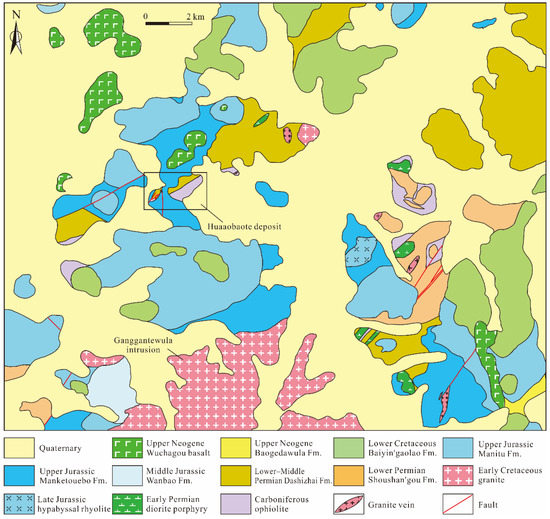 Simplified regional geological map of the Huaaobaote area (modified after [52]).