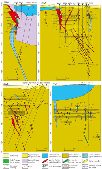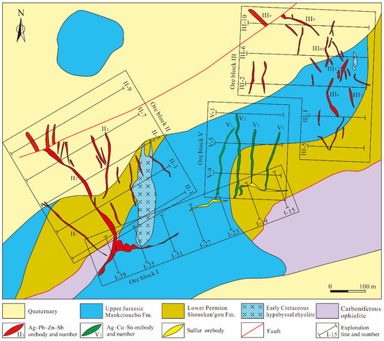 According to the distribution of the orebodies, the deposit is divided into four ore blocks numbered I to IV (Figure 3). Ore block I, at the southern end of the deposit, is mainly composed of Ag–Pb–Zn–Sb orebodies and pyrite–pyrrhotite orebodies (Figure 3 and Figure 4a). Of them, orebody I1, with a length of 250 m and an extended depth of 273 m, is one of the typical Ag–Pb–Zn–Sb orebodies in the deposit. The orebody is mainly hosted in the contact zone between the Carboniferous serpentinized harzburgite and the Permian sandstone, which dips SSE at 45°–60°. At the intersection of the NW-trending faults and the contact zone, orebody I1 usually dilates as a cystic column or rhombic column (Figure 3 and Figure 4a). Ore blocks II and III, located in the west and east of the deposit, respectively, consist of Pb–Zn–Ag–Sb orebodies. These orebodies are dominantly hosted in the Permian siltstone and are mainly controlled by the NW-trending faults, with some being controlled by near N- and NNE-trending faults (Figure 3 and Figure 4b,c). Orebody II2, with a length of 450 m, a thickness of 0.7–60.1 m, and an extended depth of 530 m, is the largest orebody in ore blocks II and III and dips to the NE at 45°–70°. Ore block V, located in the central region of the deposit, is dominated by Ag–Cu–Sn orebodies, and these orebodies are controlled by NNE- and near N-trending faults with a large dip angle of 80°–90° (Figure 3 and Figure 4d). The Early Cretaceous hypabyssal rhyolite veins are mainly distributed along nearly N-trending faults with dip angles of 70°–80°, in which a small amount of low-grade stockwork mineralization develops (Figure 3).