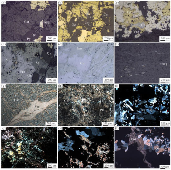 The ore minerals of the Sn orebodies in ore block V are mainly cassiterite, pyrite, and arsenopyrite, with gangue mineral of quartz (Figure 5a,i). The ore minerals of the Ag–Cu–Sn orebodies in ore block V are mainly chalcopyrite, cassiterite, arsenopyrite, pyrite, and freibergite, with gangue minerals of quartz, sericite, and chlorite (Figure 5b,c,j,k). The ore minerals of the Ag–Pb–Zn–Sb orebodies in the deposit are mainly galena, sphalerite, jamesonite, and freibergite, with gangue minerals of quartz and calcite (Figure 5d,e,l). The ore minerals of the Ag orebodies in ore block II are mainly argentite and pyrargyrite, with gangue minerals of quartz and calcite (Figure 5f). The ores’ texture is anhedral granular, subhedral granular, radial, metasomatic dissolution, and exsolution (Figure 5a–f). The ore structure is mainly vein, massive, and densely disseminated structures, followed by stockwork and breccia structures (Figure 6a–f). The wall-rock alteration is well-developed in all of these four ore blocks, and mainly includes silicification, sericitization, chloritization, carbonation, and pyritic phyllic alteration, with a small amount of pyrophyllization and kaolinization (Figure 5g–l).