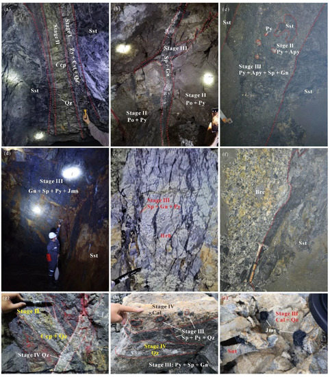 Based on the crosscutting relationships of veins, ore fabrics, and mineral assemblages, four ore-forming stages are recognized (Figure 6): cassiterite–arsenopyrite–pyrite–quartz (stage I), cassiterite–chalcopyrite–pyrite–freibergite–arsenopyrite–pyrrhotite–quartz (stage II), sphalerite–galena–jamesonite–stibnite–freibergite–silver mineral–quartz–calcite–chlorite (stage III), and argentite–pyrargyrite–pyrite–quartz–calcite (stage IV).