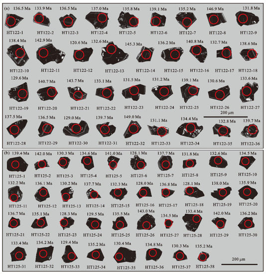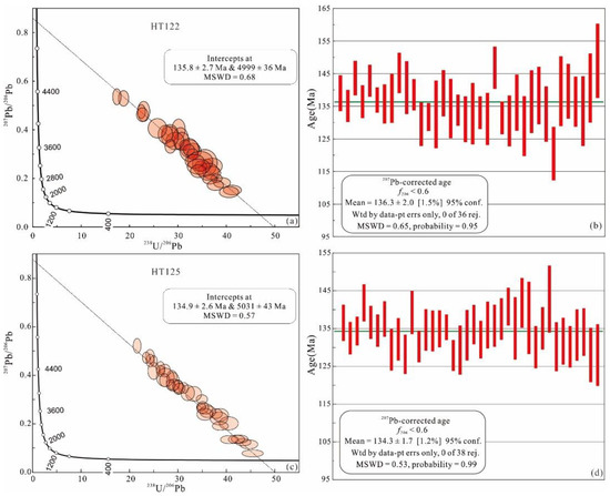 Thirty-six spots on sample HT122 yielded a Tera-Wasserburg concordia lower intercept age of 135.8 ± 2.7 Ma (MSWD = 0.68; Figure 8a) and a weighted mean age of 136.3 ± 2.0 Ma (MSWD = 0.65; Figure 8b). Thirty-eight spots on sample HT125 yielded a Tera-Wasserburg concordia lower intercept age of 134.9 ± 2.6 Ma (MSWD = 0.57; Figure 8c) and a weighted mean age of 134.3 ± 1.7 Ma (MSWD = 0.53; Figure 8d). All these age data are consistent within the limits of error; thus, the age of 136.3–134.3 Ma is interpreted to be the mineralization age of the Huaaobaote deposit.