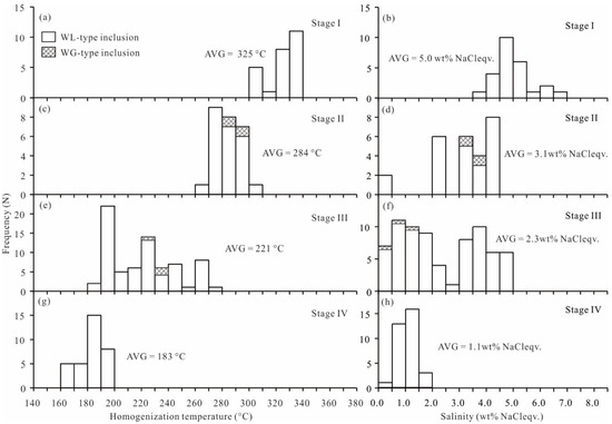 Histograms of homogenization temperature and salinity of fluid inclusions in the Huaaobaote deposit. (a) Homogenization temperature of stage I, (b) salinity of stage I, (c) homogenization temperature of stage II, (d) salinity of stage II, (e) homogenization temperature of stage III, (f) salinity of stage III, (g) homogenization temperature of stage IV, (h) salinity of stage IV.