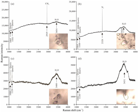 Laser Raman spectra for fluid inclusions in quartz from the Huaaobaote deposit. (a) WL-type FIs of stage I; (b) WL-type FIs of stage II; (c) WL-type FIs of stage III; and (d) WL-type FIs of stage IV.