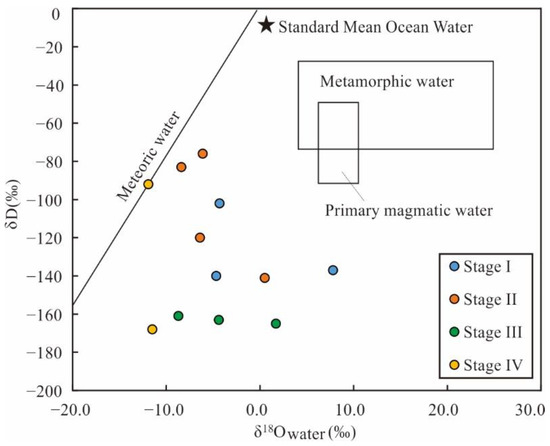 The analytical results for the oxygen isotopes of 12 quartz samples and hydrogen isotopes of fluid inclusions of the Huaaobaote deposit are listed in Table 4 and plotted in Figure 12. Three samples from stage I have δD values of −140‰ to −102‰, δ18Oquartz values of 1.4–13.9‰, and δ18Owater values of −4.6‰ to 7.9‰, respectively. The δD, δ18Oquartz, and δ18Owater values of four samples from stage II are −141‰ to −76‰, −0.9‰ to 8.0‰, and −8.4‰ to 0.5‰, respectively. The δD, δ18Oquartz, and δ18Owater values of three samples from stage III are −165‰ to −161‰, 1.7–12.1‰, and −8.7‰ to 1.7‰, respectively. Two samples from stage IV have δD values of −168‰ and −92‰, δ18Oquartz values of 0.9‰ and 1.3‰, and δ18Owater values of −11.9‰ and −11.5‰, respectively.