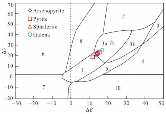 The sulfur isotopic compositions of the five pyrite, one sphalerite, one arsenopyrite, and two galena samples are presented in Table 5 and Figure 13. The δ34S (‰) values of three pyrite samples from stage I are between −0.2 and 0.3. The δ34S (‰) values of one arsenopyrite sample and pyrite sample from stage II are 0.6 and 1.1, respectively. The δ34S (‰) values of two galena samples, one pyrite sample, and one sphalerite sample from stage III are −3.4 to −0.9. In brief, the overall variation range of the δ34S values is −3.4‰ to 1.1‰ (mean −0.5‰).