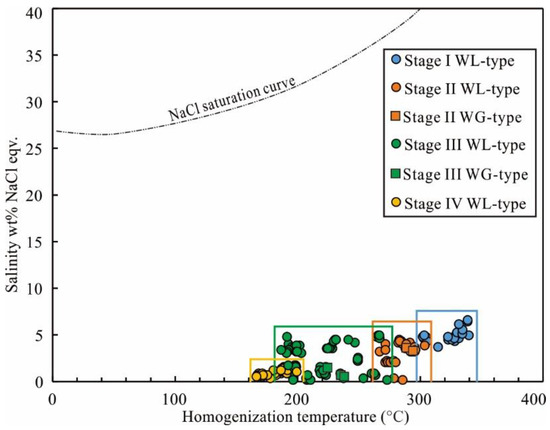 FIs in the quartz of stage II: Four FIAs have been recognized. The homogenization temperature of the WL-type FIAs varies from 267 °C to 304 °C; the final ice melting temperature ranges from −2.7 °C to −0.1 °C, corresponding to salinities of 0.2–4.5 wt% NaCl eqv.; and the fluid density is 0.73–0.80 g/cm3. The homogenization temperature of the WG-type FIAs varies from 288 °C to 293 °C; the final ice melting temperature ranges from −2.1 °C to −1.9 °C, corresponding to salinities of 3.2–3.5 wt% NaCl eqv.; and the density of the fluid is in the range of 0.75–0.77 g/cm3.