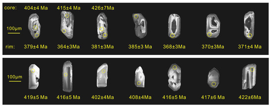 Zircon grains from the quartz-monzonite sample 87–239 were dated by LA-ICP-MS to obtain the crystallizing age of the North Kudi pluton, and the results are presented in Table S1. Zircon crystals in the sample 87–239 from the North Kudi pluton are pale pink and 150–300 μm in size with length/width ratios of 1.5:1–3:1 (Figure 3). Most zircon grains are characterized by weak or blurred oscillatory magmatic zoning with Th/U ratios ranging from 0.30 to 1.47. Forty-four spot analyses on these zircons yielded a weighted mean 206Pb/238U age of 414 ± 2 Ma (2σ, MSWD = 1.6) (Figure 4). Interestingly, there are a few zircon crystals with convoluted textures in CL images (Figure 3). For example, four zircon grains have recrystallized rims with Th/U ratios of 0.36–0.69 (Figure 5), and three zircon crystals have dark cores and bright rims in CL images. Seven spot analyses on these recrystallized areas yielded a weighted mean 206Pb/238U age of 373 ± 8 Ma (2σ, MSWD = 1.6) (Figure 4). When all the analysis spots are potted in the coordinate diagram, the Concordia lower intercept age is 403 ± 8 Ma (2σ, MSWD = 3.0).