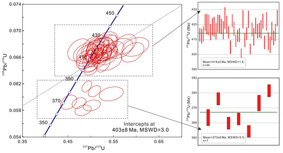 Previous geochronological studies on the North Kudi pluton based on Ar–Ar, single zircon TIMS U–Pb, and zircon SHIMP U–Pb methods yielded a wide span of its formation age from ~384 Ma to ~421 Ma [26,27,44]. Zircon is usually crystallized during the early stage of magma evolution and can survive from most late-stage magmatic, metamorphic, and erosional processes [59]. Thus, the zircon U–Pb age can provide the best estimation of the crystallization age for magmatic rocks [40]. However, the single zircon TIMS U–Pb age is unsuitable for zircons with xenocryst cores because the yield age using the single zircon TIMS U–Pb method will be older than the crystallization age of the pluton.