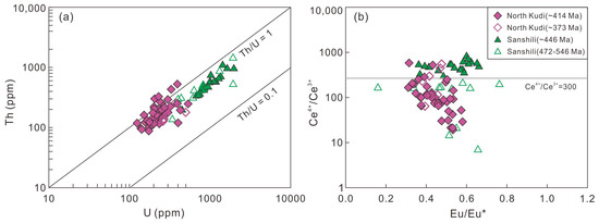 Th versus U (a) and Ce4+/Ce3+ versus Eu/Eu* (b) for zircon grains from the North Kudi and the Sanshili pluton in the Western Kunlun orogen. The composition of zircon grains from the Sanshili pluton is from [40].