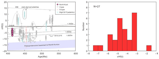 In situ zircon Lu–Hf isotope analyses were performed on the same area, previously dated by LA-ICP-MS. The results are presented in Table S2 and graphically illustrated in Figure 6. Zircon grains from the North Kudi pluton have 176Hf/177Hf of 0.282321–0.282472 with corresponding εHf(t) values of −7.39 to −2.00. The recrystallized areas of zircon grains display a narrow range of 176Hf/177Hf from 0.282378 to 0.282450 with εHf(t) from −6.41 to −3.70.