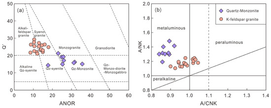 Q’-ANOR normative diagram for samples from the North Kudi pluton [56] (a,b) A/NK versus A/CNK diagram for the North Kudi pluton.