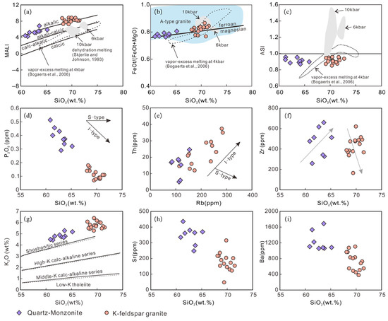 Major and trace element compositions of samples from the North Kudi pluton. MALI versus SiO2 (a), FeOt/(FeOt + MgO) versus SiO2 (b), and ASI versus SiO2 (c) are after [18]. (d–i): Harker diagrams for samples from the North Kudi pluton.