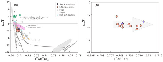 The Sr–Nd isotopic data are given in Table S3. The present data and those from the literature are all shown in Figure 10. The quartz-monzonite samples from the North Kudi pluton (including literature data) have (87Sr/86Sr)i of 0.708214 to 0.710415 and εNd(t) of −3.14 to −3.39. K-feldspar granite samples also display a wide variation of (87Sr/86Sr)i from 0.708244 to 0.710133 but a narrow range of εNd(t) from −4.32 to −2.27 (Figure 10). In summary, samples from the North Kudi have relatively uniform εNd(t) but a variable Sr isotopic composition (Figure 10).