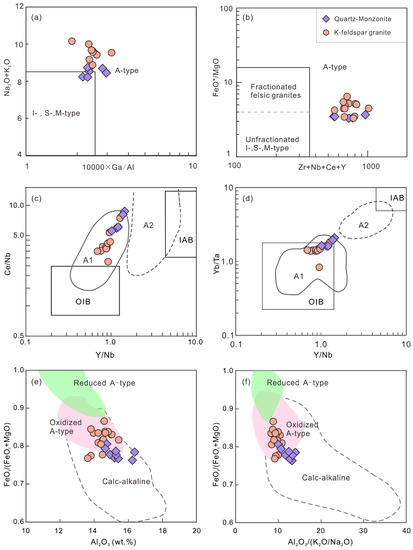 Discriminant diagrams to distinguish A granites. Na2O + K2O versus 10,000 × Ga/Al (a) and FeO*/MgO versus Zr + Nb + Ce + Y (b) diagrams [12]; Ce/Nb versus Y/Nb (c) and Yb/Ta versus Y/Nb (d) diagrams after [6]; FeOt/(FeOt + MgO) versus Al2O3 (e) and FeOt/(FeOt + MgO) versus Al2O3/(K2O/Na2O) (f) diagrams after [16]. A1-subgroup granite shares similar geochemical characteristics with oceanic-island basalts (OIB), and A2-subgroup granite occur in post-collisional settings with arc-like geochemical compositions.