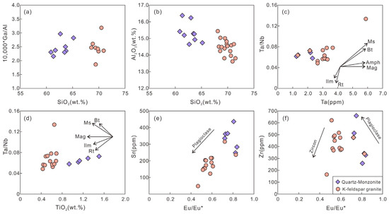 Diagrams illustrating the role of fractional crystallization of the North Kudi pluton. (a) 10,000 × Ga/Al versus SiO2, (b) Al2O3 versus SiO2, (c) Ta/Nb versus Ta, (d) Ta/Nb versus TiO2, (e) Sr versus Eu/Eu* and (f) Zr versus Eu/Eu* diagrams to show the effect of fractional crystallization on the chemical composition variation of samples from the North Kudi pluton.