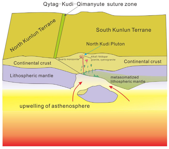 Schematic diagram showing the formatting process of the North Kudi pluton. Slab break-off or post-collisional delamination cause upwelling of the asthenosphere [80], which causes partial melting of a slightly metasomatized lithospheric mantle and forms the North Kudi pluton.