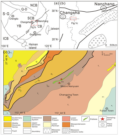Location (a,b) and geological sketch (c) of study area. (a) Adopted from [38], (b) adopted from [39], (c) adopted from the geological map from the Jiangxi Provincial Geological Information Center.