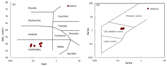 SiO2—Nb/Y (a) and Th/Yb-Ta/Y (b) diagrams of the Shangsu dolerite (a) adopted from [40], (b) adopted from [41].