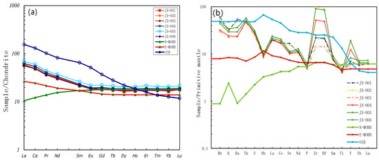 Primitive mantle-normalized multi-element diagram (a) and reference values for primitive mantle and chondrite, (b) reference values for MORB and chondrite adopted from [42].