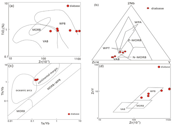 Diagrams of discrimination for the tectonic setting of the Shangsu dolerite. (a) Adopted from [41], (b) adopted from [44], (c) adopted from [45], (d) adopted from [46].