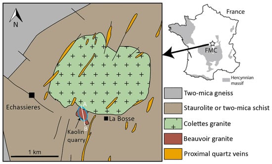 Simplified geological map of the Beauvoir granite area modified after [31]. The line AB corresponds to the cross-section of Figure 2.