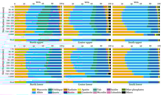 The modal mineralogy of the six samples calculated by MLA and shown in Figure 6 are in agreement with the global mineralogy of the Beauvoir granite as described in the literature. Indeed, the granite is mainly composed of four mineral phases in order of importance: albite, muscovite, quartz and K-feldspar, making up at least 90 wt% of all samples. Head proportions of those major minerals do not change drastically from north to south and vertically for center and south. However, the north upper sample has a greater K-feldspar content (20 wt% against 3–1 wt%). Generally, K-feldspar content increases from south to north at the expense of albite. Its content passes from around 3 wt% in the south lower sample to 20 wt% in the north upper one. Muscovite is always more abundant in the coarser size fractions and accounts for more than 60 wt% in the fraction > 1 mm of both south samples. Accessory mineral phases include kaolinite, apatite, biotite, cassiterite and other minor phases. There is a clear difference in the content of kaolinite between upper and lower levels, marking the most intense kaolinization close to the surface, especially in the case of north and center positions where kaolinite represents almost 5 wt% of the sample and 10% in the <36 µm. Accessory minerals such as cassiterite, microlite or apatite are more abundant in the upper part of the deposit. Peculiar mineral phases classified in the “others” group in Table 2 such as topaz, fluorite or zircon can overpass 5 wt% in the central zone of the deposit.