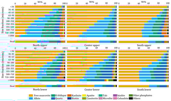Figure 9 displays the major gangue phases associated with muscovite, which globally reflect the modal mineralogy of Figure 6. The percentage of free muscovites in the ground ore increases from 45 wt% in north upper to 60–65 wt% in north center and south. This is in accordance with the results from Figure 8, which indicates an increase in muscovite size from north to south upper sample. Regardless of the position in the deposit, the major gangue minerals in association with muscovite are albite, quartz and K-feldspar. K-feldspar seems less associated with muscovite compared with quartz because sometimes it represents just a few percent of the total ore, but in reality, muscovite and K-feldspar are often associated. For instance, the K-feldspar content in the south upper sample is less than 3 wt% (see Figure 6) but represents 12% of muscovite associations, whereas quartz content is 18 wt% but represents 5% of muscovite associations. MLA results have shown that among the metal-bearing accessory minerals, cassiterite is the one most associated with muscovite, especially in the southern area of the deposit where up to 80% of cassiterite is associated with muscovite in the fraction above 710 µm. Nb-Ta minerals are also associated with muscovite. This confirms optical microscopic observations which have shown inclusions of Nb-Ta minerals and cassiterite inside the micas. In addition, it seems that the percentage of association with minerals containing Nb, Ta, Sn and Be increases in the southern part of the deposit.